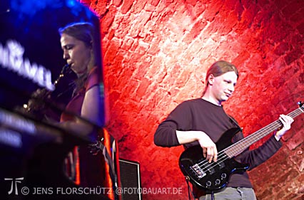 Am Ende eines vielseitigen Jazz-Abends lud die Hallenser Familie Lemme in das ‚:Zentralcafé’ ein. Zur Band gehören die Saxophonistin Ulrike Lemme, ihre Brüder Matthias und Holger an Gitarre und Bass sowie der Schlagzeuger Knut Scheller. Hoffentlich hatte die Jazzpolizei gegen Mitternacht schon Feierabend. Sonst hätte das wohl eine Anzeige gegeben. Die Mitstreiter des ‚:Zentralcafé’ spielen nach eigenen Aussagen nämlich ohne Dienstausweis. Sie sind auch „keine Sachverständigen akademischen Schwermuts und amtlicher Spielkultur“ dafür bliesen sie noch mal frische Luft in die Tonne und brachten die Zuschauer zu später Stunde ordentlich zum Zappeln. Gleich der erste Titel groovte, ging so richtig los und hatte Kraft. „Futzi“ hieß der spektakuläre Einstieg. Mit Stücken wie „Planquadrat“, „Kabeljau“, „Sportsoldatinnen“ bewiesen sie Phantasie und Humor nicht nur bezüglich der Namensgebung sondern auch bei den kompositorischen Ideen und der Interpretation. Mit Spielfreude schufen sie anspruchsvolle und ebenso partytaugliche Unterhaltungsmusik. Das Saxophone gab starke Hooks vor. Das hatte Swing und Funk, das groovte und drückte. Zum Schluss wurden sie noch ihre Hommage an einen ganz lieben, coolen Typen los, an die „Fettbacke“, an den neun Monate alten Neffen, an den Sohne des Bruders Holger. Und bei dieser Ansage sah man keine Fettbacke aber mindesten drei mal zwei Grinsbacken. Tolle Familie! pepe |