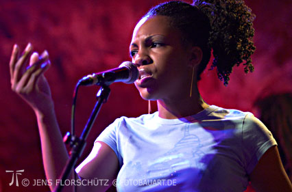 Schon lange nicht mehr war die Veranstaltungstonne so überfüllt gewesen. Die Spannung war groß. Und das Publikum wurde von der fieberhaft erwarteten Soul-Diva auch kein bisschen enttäuscht. Mit dem ersten Titel bis zum Schluss verausgabte sie sich körperlich, stimmlich und emotional. Wenn dann die Stimme plötzlich einfach weg blieb, vielleicht aufgrund der Erkältung, mit der sich die Sängerin plagte, vielleicht aber auch, weil die Interpretin zuweilen selbst von der großartigen Stimmung ergriffen war, dann sangen ihre Fans längst textsicher weiter. |