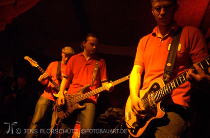 Und dann kamen die heiß erwarteten Preisträger des Vorjahres-Courage-Festivals und zeigten keinerlei Schwachpunkte. Die viel zu kleine Bühne wussten sie ideal für sich zu nutzen. Organisation ist eben alles. Und daher ging es sehr aufgeräumt auf dem kleinen Fleckchen zu. Im Einheitslook - Jeans und rote T-Shirts - bildeten sie eine Formation. Die Staffelung gab dem Frontmann Platz für seine sportlichen Bewegungen und zielte angriffslustig aufs Publikum. Sequoyah ist eine starke Liveband. Deshalb ist es sehr viel besser ihre Shows zu erleben, als nur ihre Konserve ins Schubfach des CD-Players zu legen. (Wobei, dass dies auch kein Fehler ist, dazu an anderer Stelle » Rezension). Hoch energetisch und schnell verlief ihr Programm. Die Anwesenden waren zu tiefst begeistert, tanzten heftig und gingen voll zu den mitreißenden Titeln ab - Pfiffe, Schreie und glückliche Gesichter!